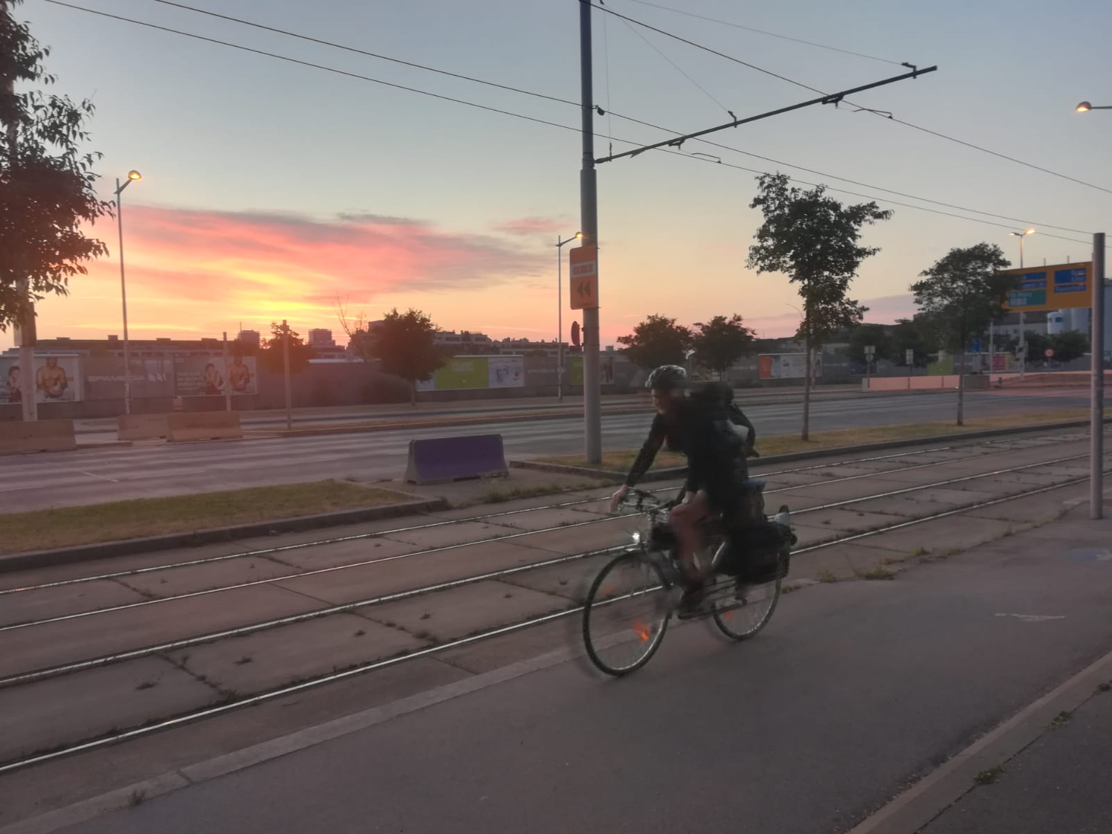 In der Morgendämmerung packe ich die letzten Dinge auf mein Rad, die ich gestern noch nicht in den Garten gebracht habe. In der aufgehenden Morgensonne geht’s schließlich auf zum Bahnhof – mit dem Rad natürlich.