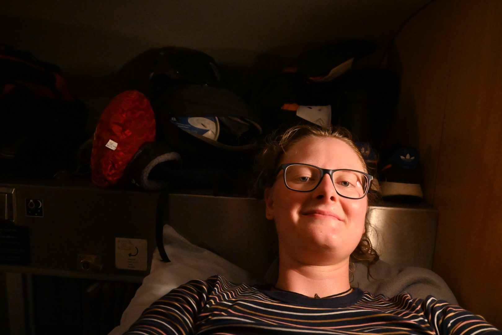 Es gestaltet sich schon mühsam, mit so einem großen Paket rein zu kommen. Unter den Liegen hat das Fahrrad halb Platz, somit ist es ein bisschen eng im Abteil. Sorryyyy! Aber es geht! Notiz an mich: oben im Liegewagen gibt’s super viel Platz und auch einen Nachttisch. Gut gewählt!
