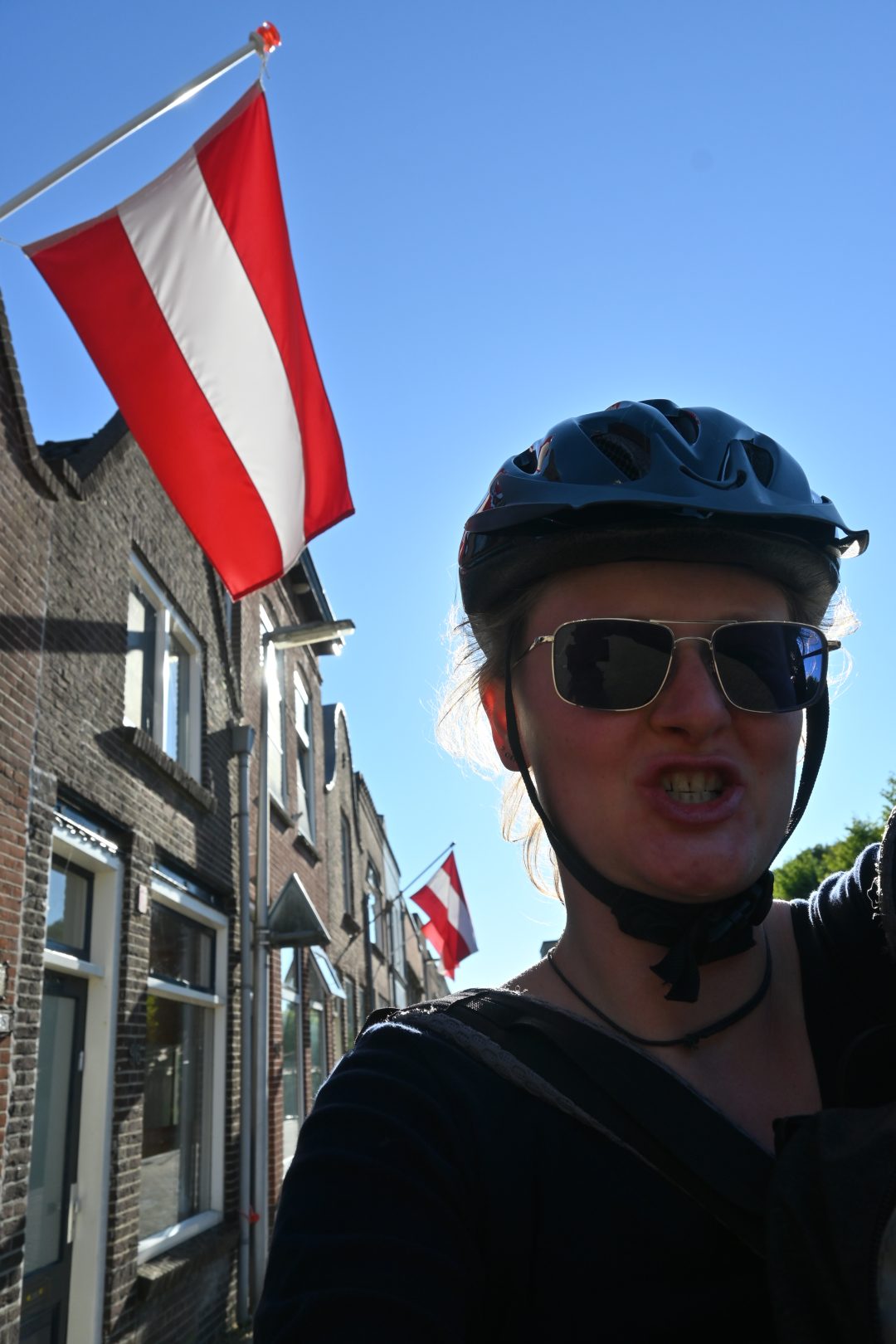Nach kurzer Rücksprache mit Einheimischen, warum hier die Österreichische Flagge hängt, wird mir gesagt, das sei die Flagge von Gouda. Aber spätestens beim Überqueren des Grenzgebietes Utrecht wird mir bei Betrachtung deren Fahne (Rot mit weißen Kreuz) klar, daß die Niederländer einfach gerne Flaggen klauen. 😉