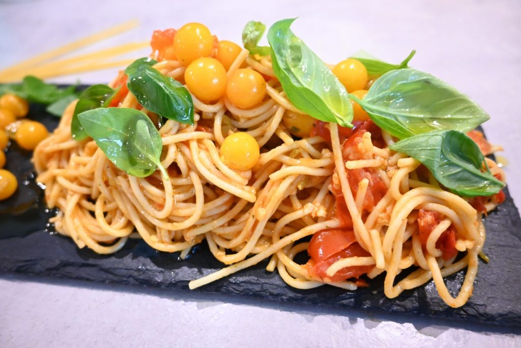 Nudeln gut abtropfen lassen, in einer heißen Pfanne maximal 1 Minute in Olivenöl anbraten