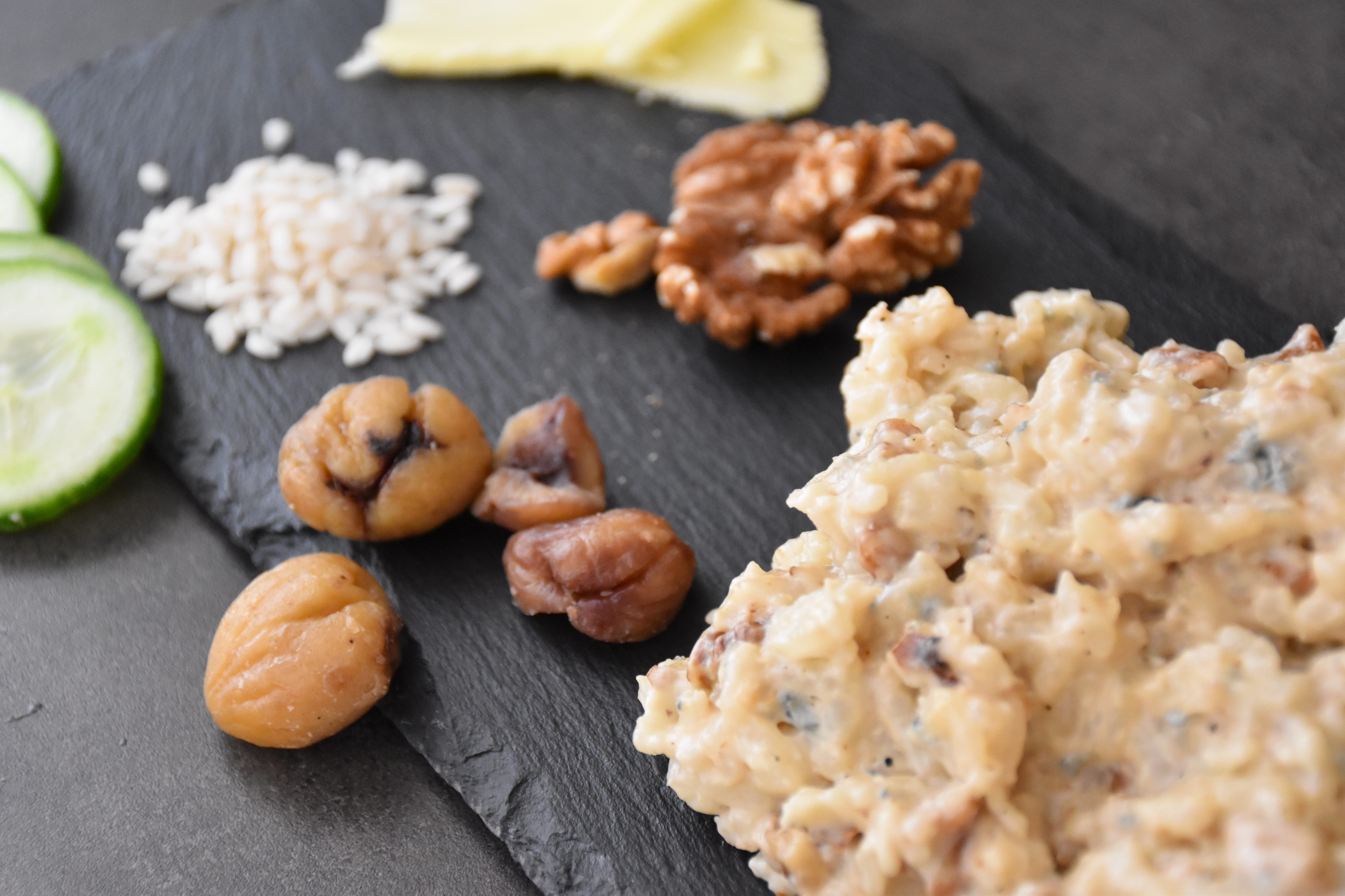 Zwiebel in Butter anbraten, Reis dazu bis glasig