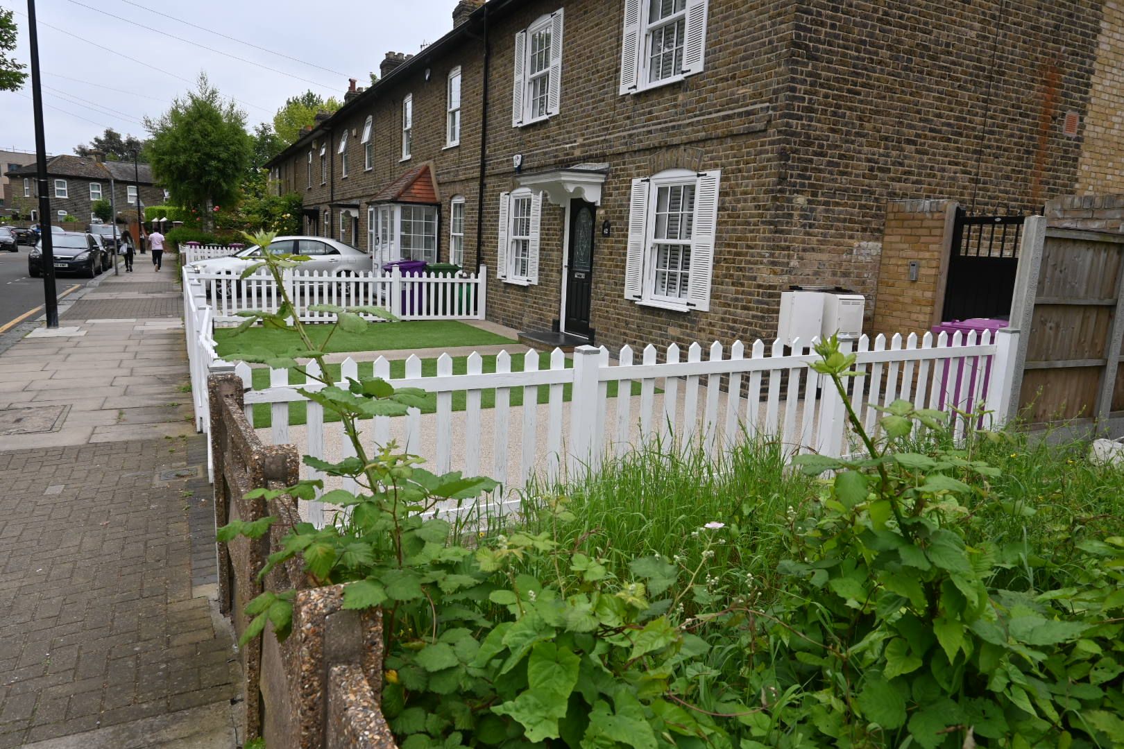 Bei den meist zweistöckigen Wohngebäuden mit kleinem Vorgarten sind alle Varianten an Gartengestaltung aufzufinden: Von komplett verwildert, gepflastert oder mit englischem Rasen ist hier alles möglich.