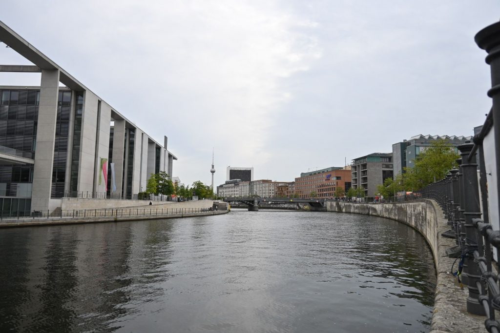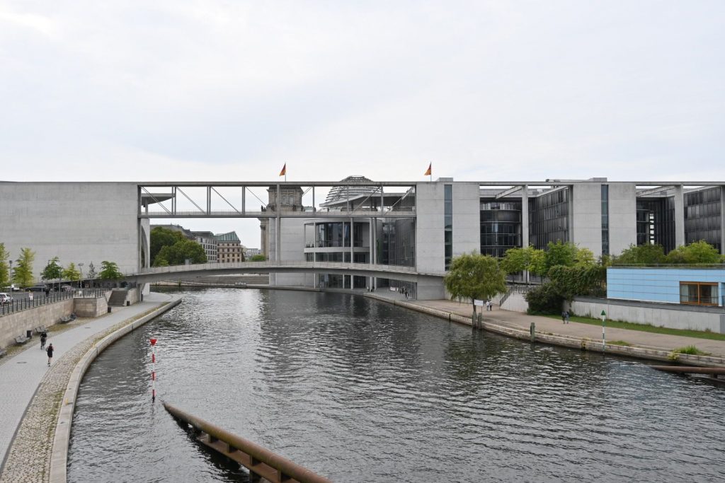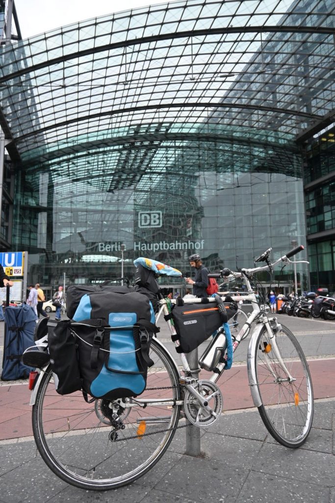 Das Fahrrad hatte wahrscheinlich eine ruhigere Nacht als ich. Gut, dass ich so viele Tücher mit hatte – es hat sehr stark gezogen und eine Schnarchtante hatten wir heute Nacht auch wieder dabei. Was denken sich schnarchende Leute, wenn sie mit dem Nachtzug im 6er Abteil fahren? Cool, heute kann ich wieder 5 andere Menschen wach halten? 😛Dann aber, nach einer Stunde liebevollem Zusammenschrauben und Specials aufmotzen im Untergeschoss vom Berliner Hauptbahnhof: Wir sind endlich angekommen! Bereit? Bereit! Schon ganz am Anfang komme ich bei der Anlegestelle des Reichstages vorbei. … vorbei am Bundeskanzleramt … … hin zum Reichstagsgebäude. Hier nochmal die Anlegestelle von der anderen Seite. Wahnsinn, wie groß das alles ist.