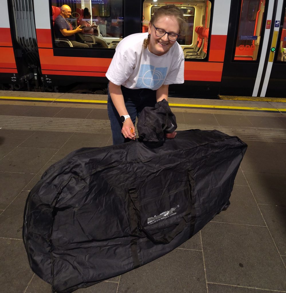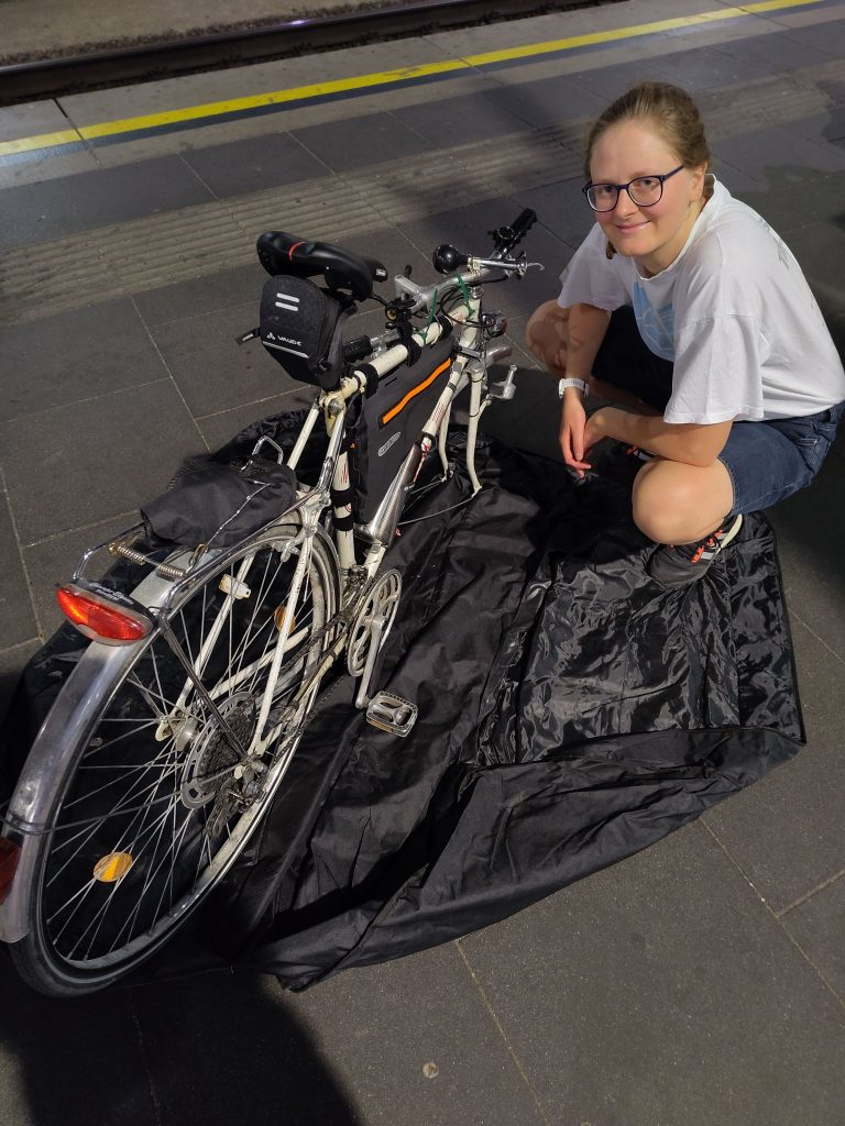 Im diesem Nachtzug gibt’s leider überhaupt keine Möglichkeit, Fahrräder zusammengebaut mitzunehmen. Also wird es demontiert. Süßes unauffälliges Packerl!