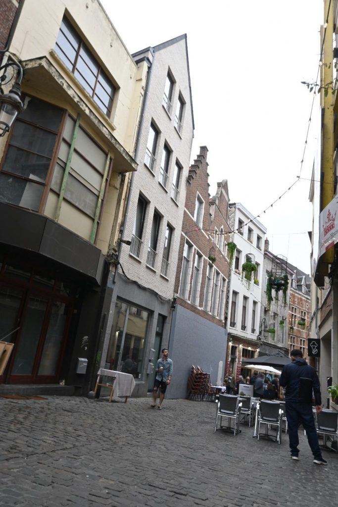 In der Rue des Bouchers, der Restaurantstraße Brüssels, bin ich verwundert über die Vielfalt der Zustände der Gebäude. Eingeschlagene Fensterscheiben neben fancy Lokal, zugenageltes Schaufenster neben Brasserie.