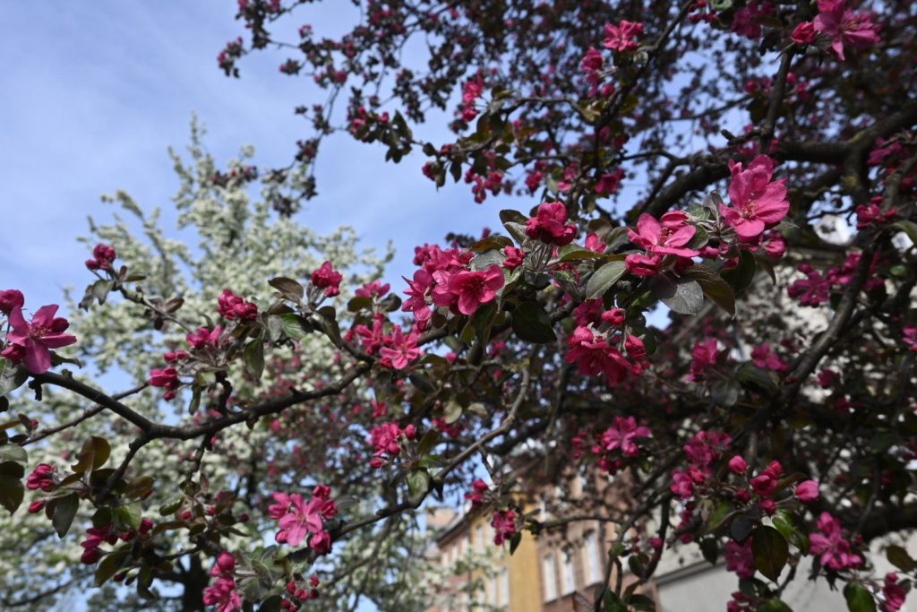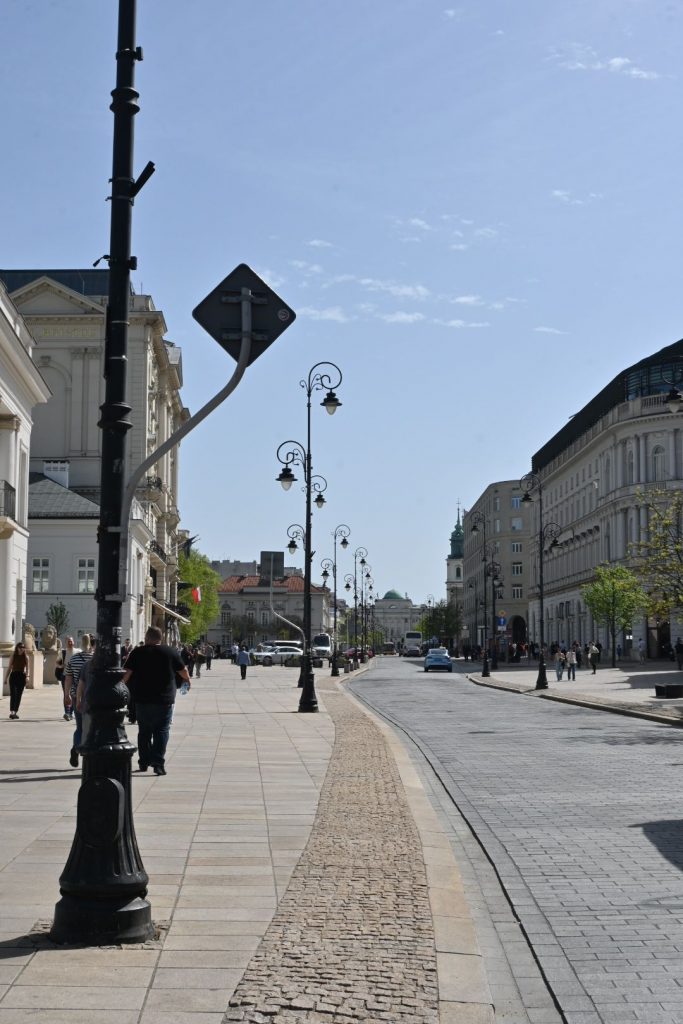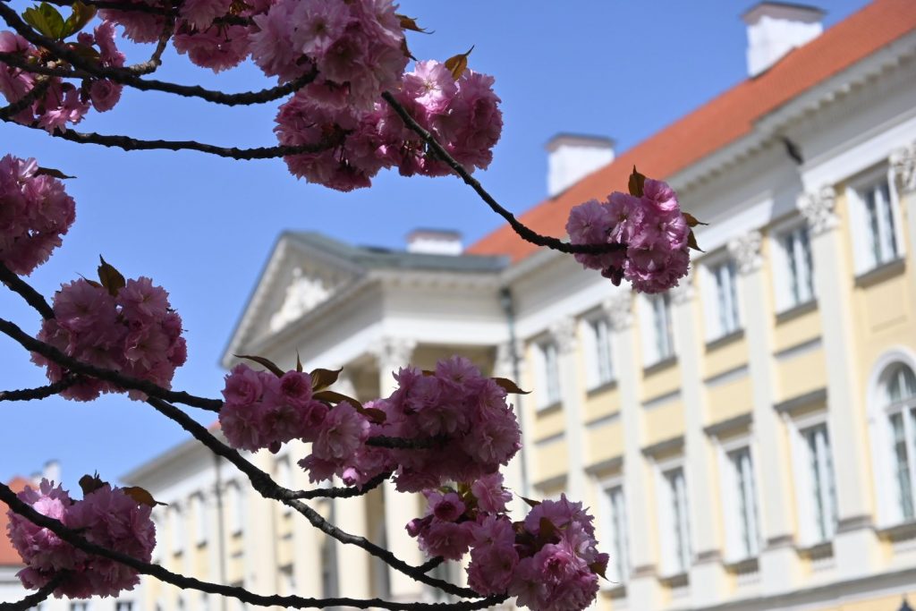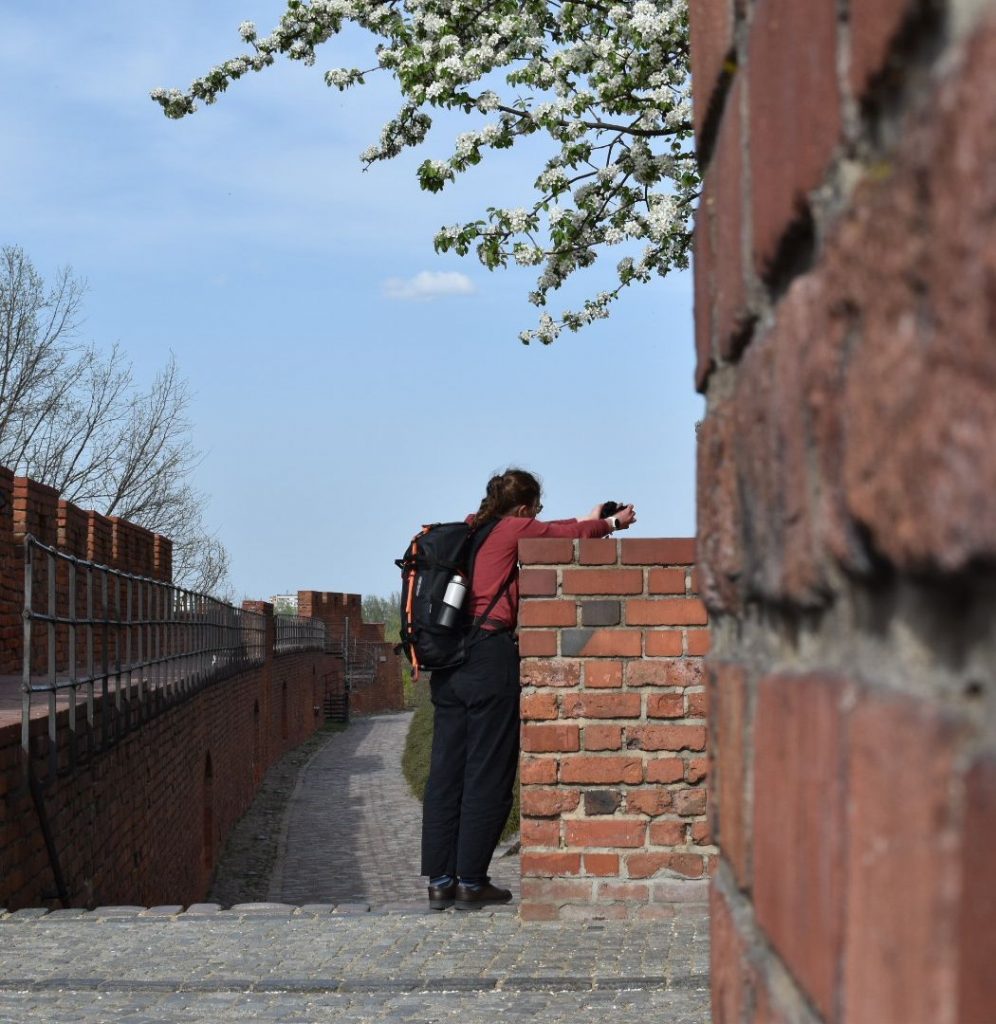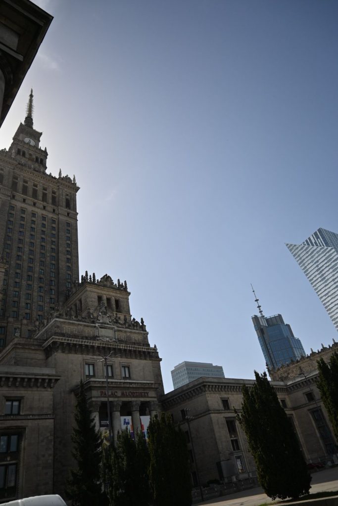 Wir rollen an einer schönen Markhalle vorbei – Hala Mirovska; innen hab ich mir die Halle mehr wie einen Markt vorgestellt, aber so finde ich sie auch schön! Nicht weit von hier entdecken wir endlich das Gebäude, welches wir schon vom Bahnhof aus gesehen haben: den Kulturpalast Pałac Kultury i Nauki. Der Kulturpalast wird flankiert von Wolkenkratzern, ein spannendes Stadtbild. Um uns einen Überblick zu verschaffen, fahren wir im Kulturpalast bis in den 30. Stock und genießen die Aussicht.Am Campus der Universität Warschau ruhen wir kurz aus. Toll ist das hier, wir sind schon an einigen Universitätsgebäuden vorbeigekommen und überall gibt es Parks mit vielen Bäumen und Sitzgelegenheiten im Innenhof. Da könnte sich die TU Wien ein Scheibchen abschneiden mit ihren versiegelten Innenhöfen. Eine sehr schöne Begegnungszone führt an allen wichtigen Bauwerken in der Altstadt vorbei. Große Plätze, kleine Gässchen. Hier fällt die spannende Bauweise der Dächer auf. Sehr oft kann man hier „aufgesetzte“ Miniaturhäuschen erkennen. Diese waren dazu bestimmt, in die finsteren Treppenhäuser der Miethäuser ohne künstliche Beleuchtung Licht zu bringen. Falls es noch nicht aufgefallen ist: Die Kirschen blühen! Was für eine Pracht!