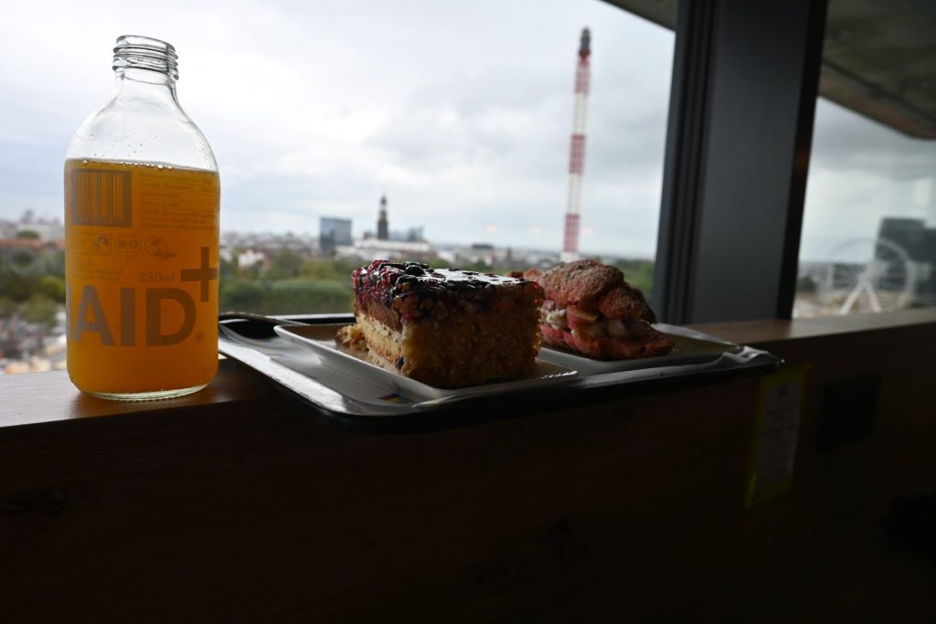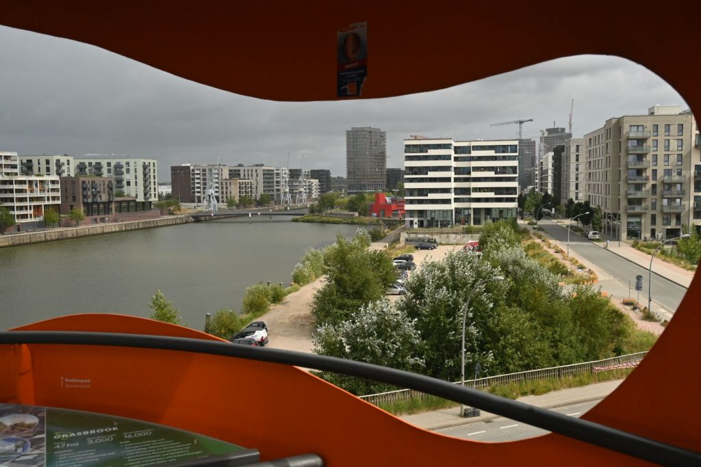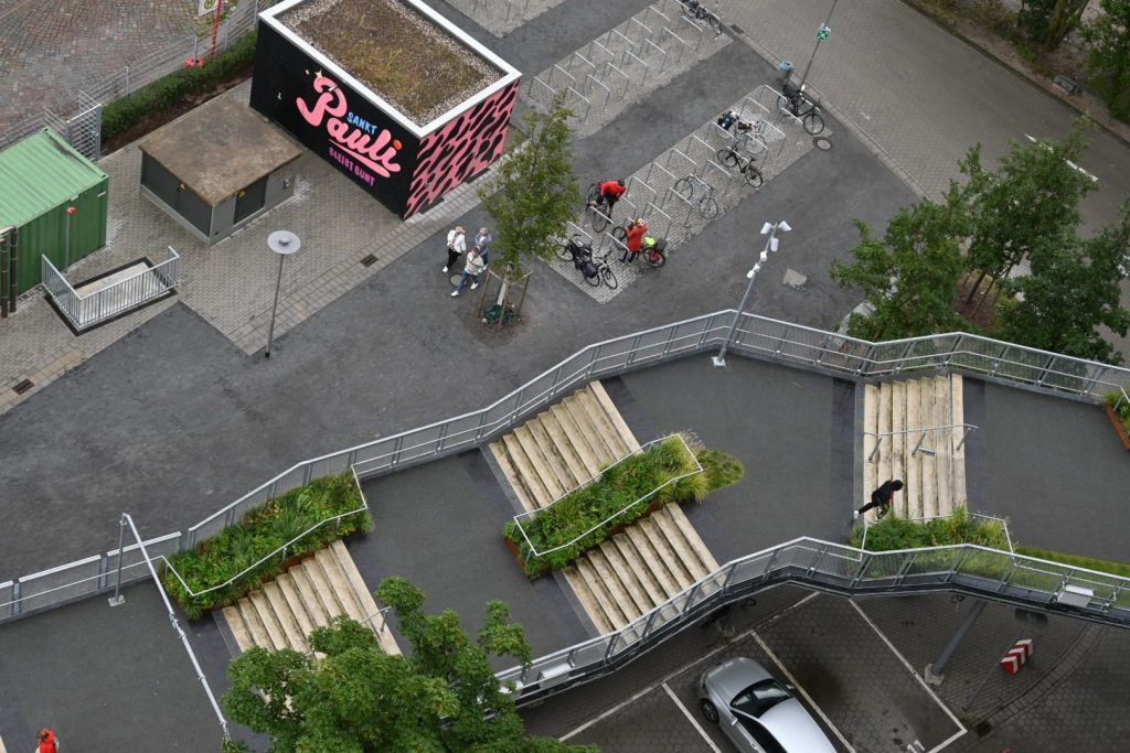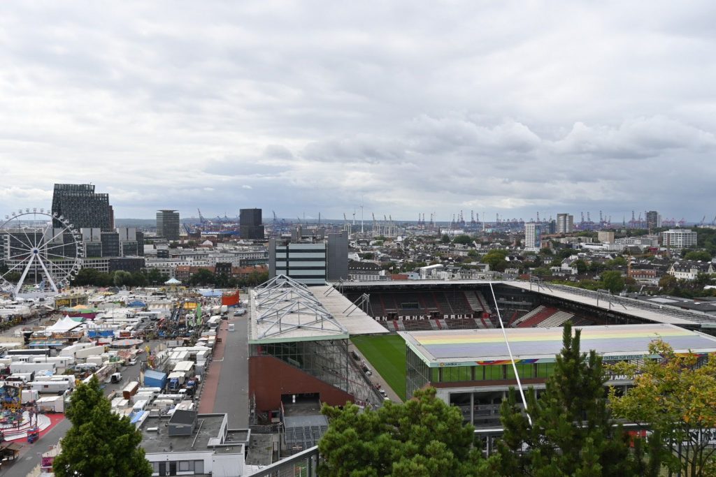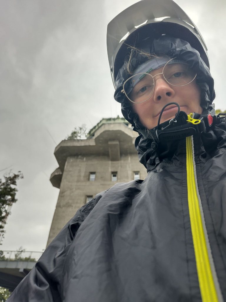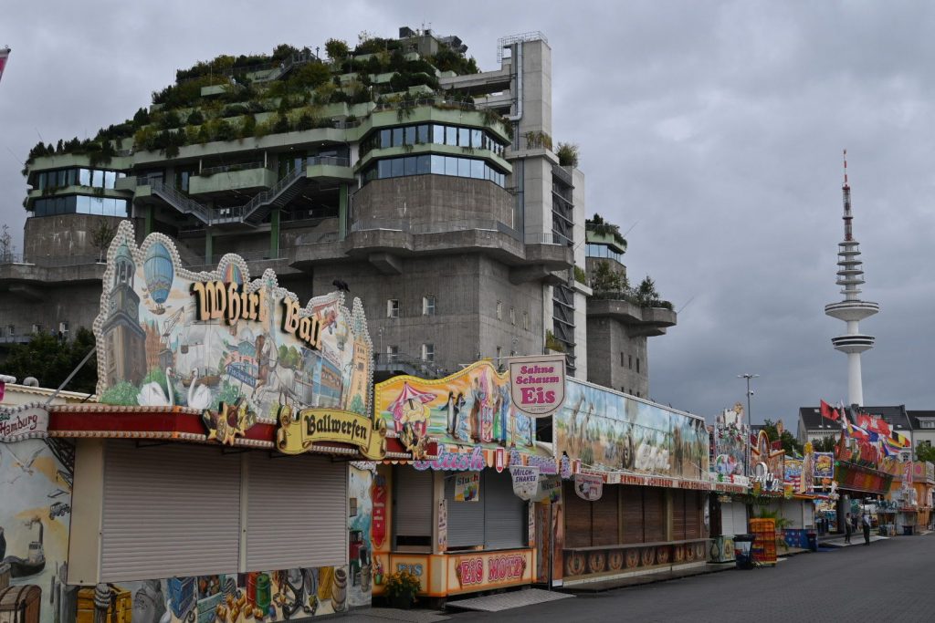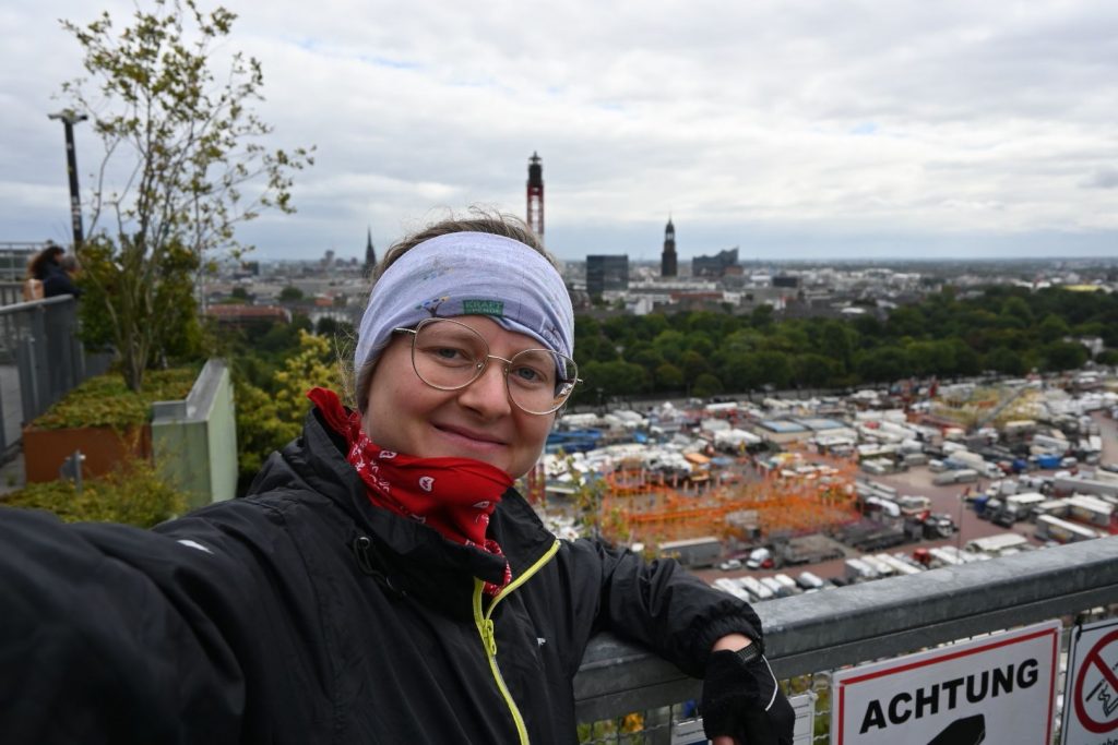 Dann geht’s zu Hamburger Dom und dem mittlerweile begrünten Flakturm daneben. Ich war 2022 schon mal in Hamburg und hab mir vieles angesehen – unter anderem war dieser Flakturm zu dieser Zeit gerade „under Construction“ mit Kran und Gerüst. Den Kontrast zwischen Vergnügungspark und Flakturm finde ich trotz dem grünen Kopfschmuck (oder gerade deswegen?) sehr faszinierend – 2 Welten prallen aufeinander. Schaurig und schön.Über einen Rundweg kann der Flakturm auch bestiegen werden. Alles außer meiner Kamera bleibt also versperrt am Rad und ich besteige den Turm. Na? Wo ist das Rad? Jause mit Aussicht, schaukelnd eingenommen. Und geschafft! Kalt is‘! Aber die Aussicht ist den Weg wert! Hier blicke ich zum Hafen… … und hier über den Dom bis zur Altstadt.