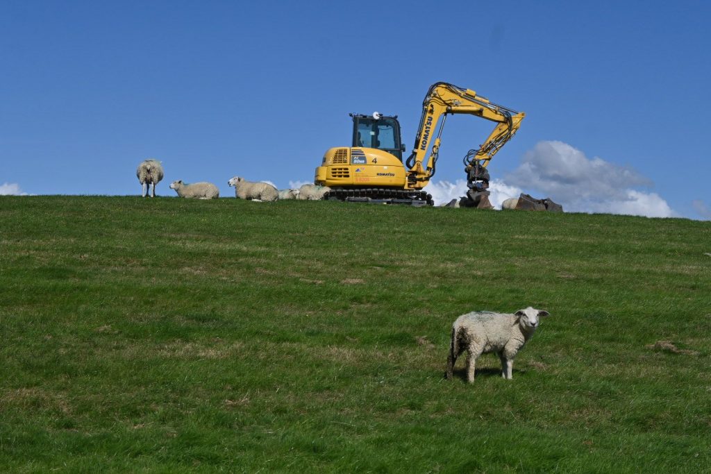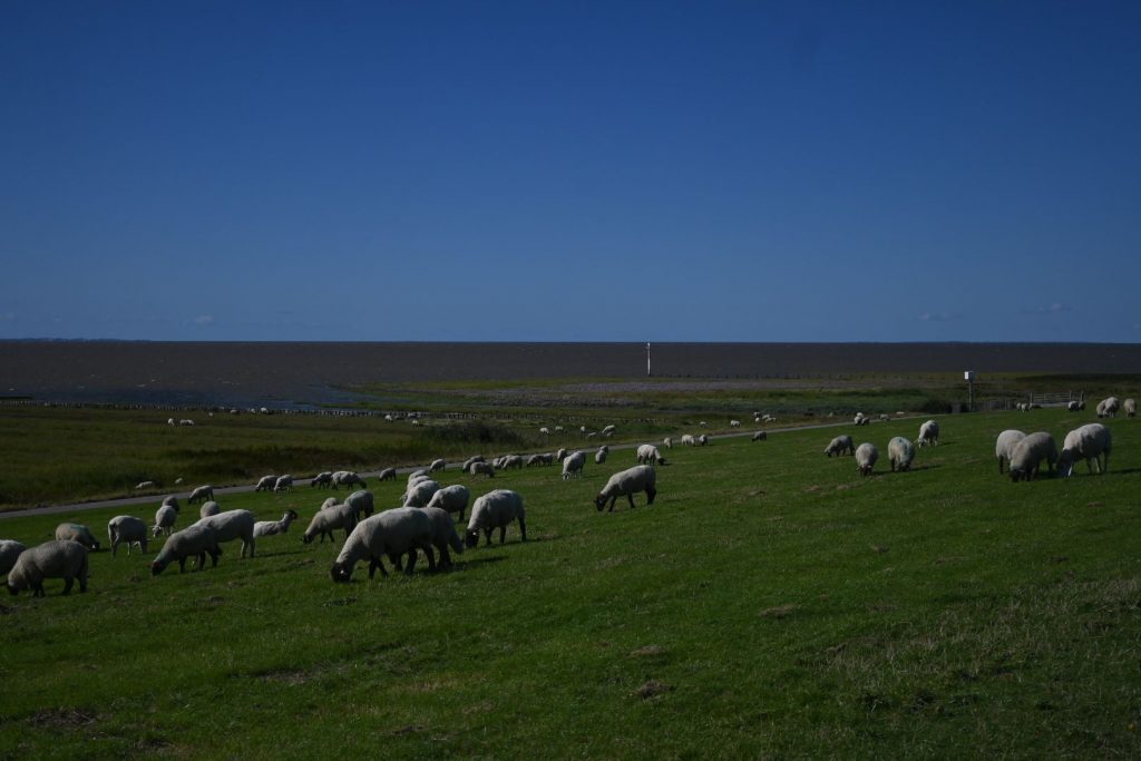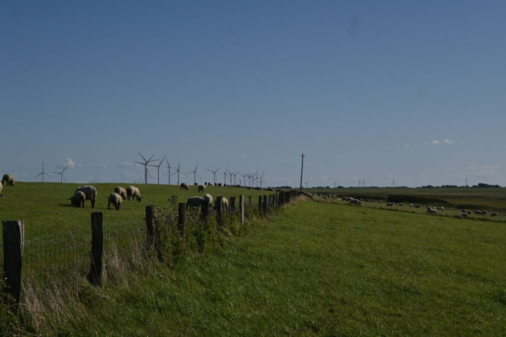 In Klanxbüll, 1 Station vor Sylt steige ich noch am Festland aus und fahre an die Küste. Hier gibt’s Kanäle, Windräder, Schafe und PV-Anlagen. Und in die andere Richtung auch. Toll – das Naturschutzgebiet. Radfahren ist aber erlaubt! Der Zaun dürfte manchmal von Schafen unterschlüpft werden… Ich hab mir evtl ein klitzekleines bisschen flauschiger Watt-Schaf-Wolle mitgenommen. Schafe gibt’s hier wirklich viele. Ganz unterschiedliche auch, mit schwarzem Kopf und Füßen oder alles weiß. Die Schafe sind da auch nicht so mit Aussehen. Was auf der Weide steht gehört dazu. Baufirma: -1 Bagger, Schafherde: +1,5 Schafe +großes Vorbild Ich hoffe, die Schafe dürfen den Bagger behalten. Dann musste ich da drüber. Voll unpraktisch, weil da ein gesicherter ungesicherter Bahnübergang war.
