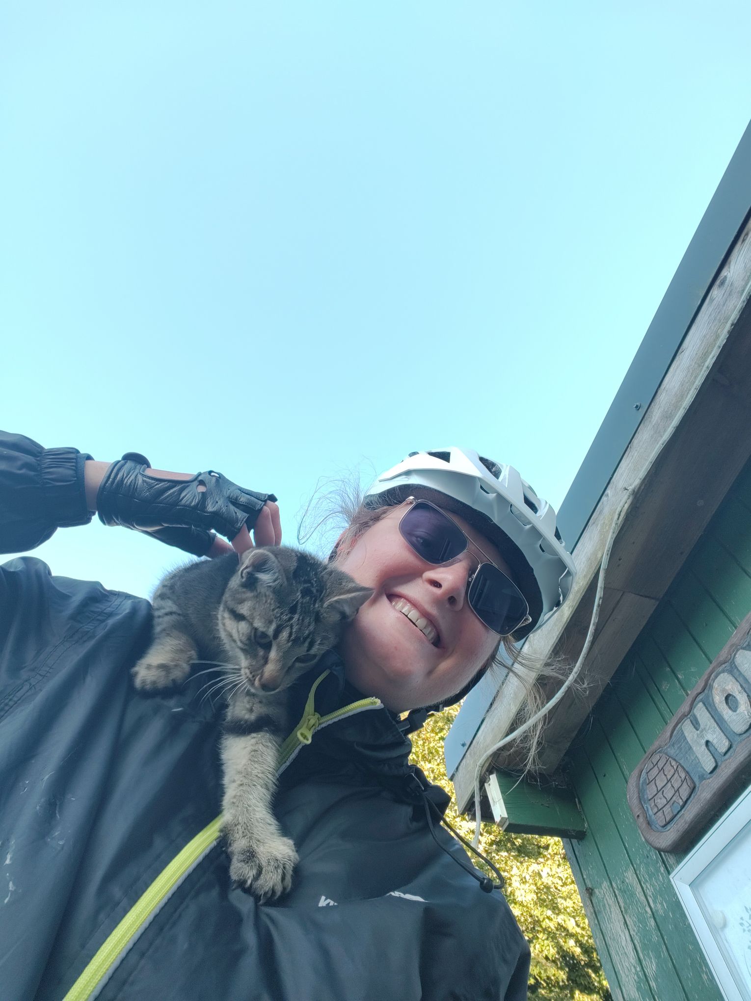 … und eine Katze findet mich. Nach ein paar Streicheleinheiten wollte sie wohl auch wissen, wie die Luft da oben ist; sprang auf mein Rad und von dort weiter in meine Arme und auf meine Schultern. Ich glaub nur leider, dass Katzen nicht so gerne Fahrrad fahren. Also: baba, Katze! <366km heute.